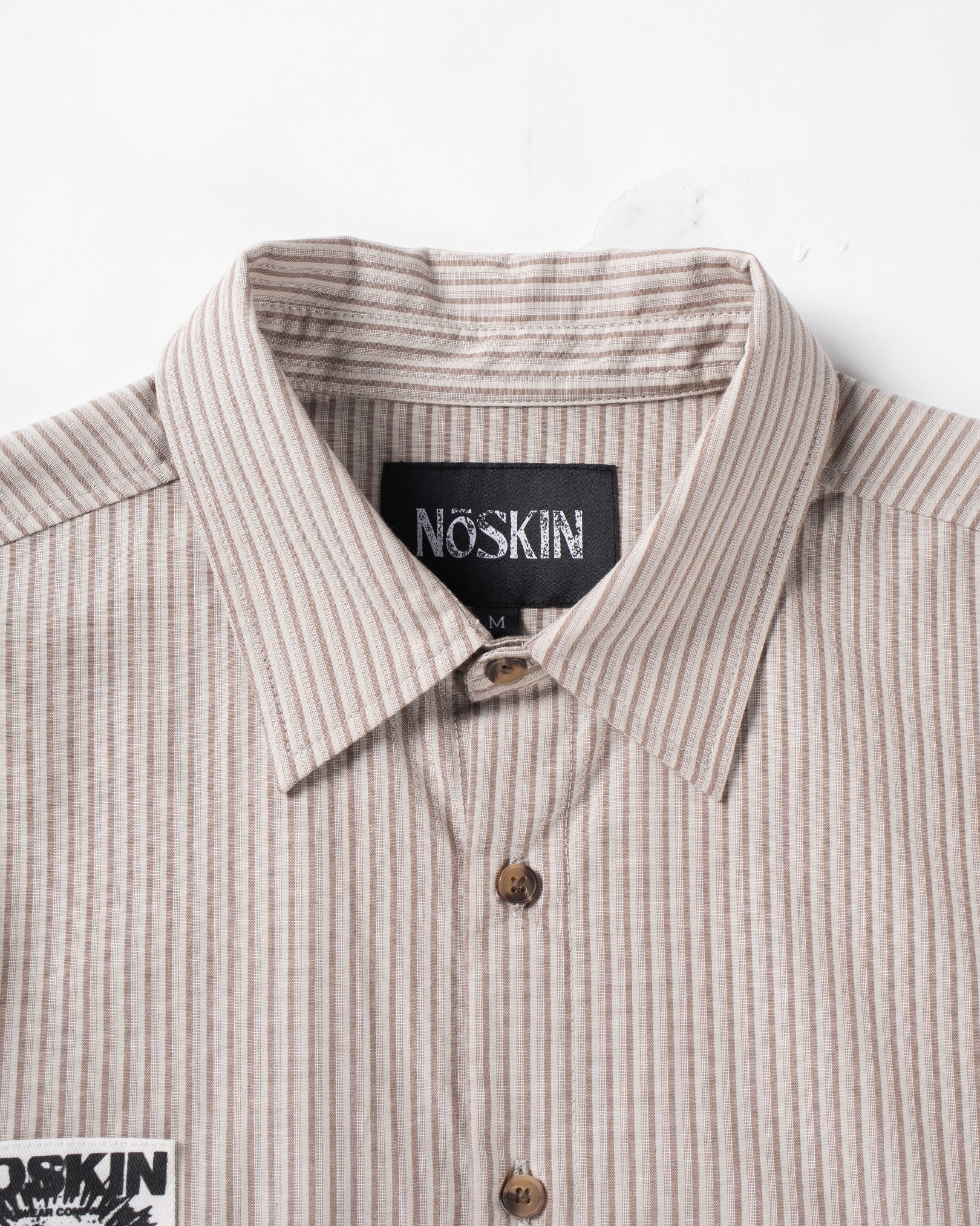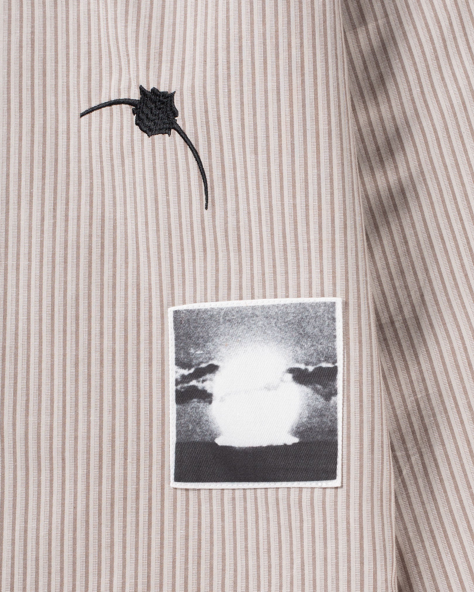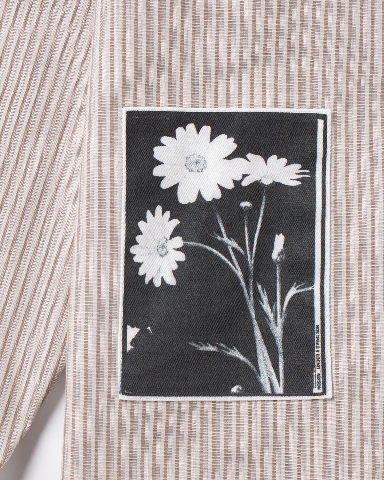 Lightweight striped button-up shirt with embroidered Under a Dying Sun motif, graphic patches and faux tortoise-shell buttons.