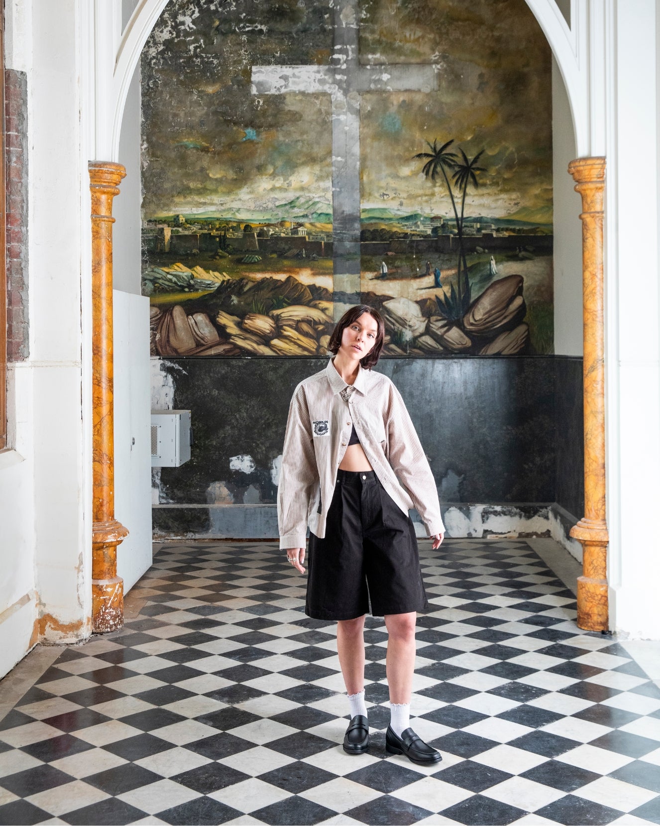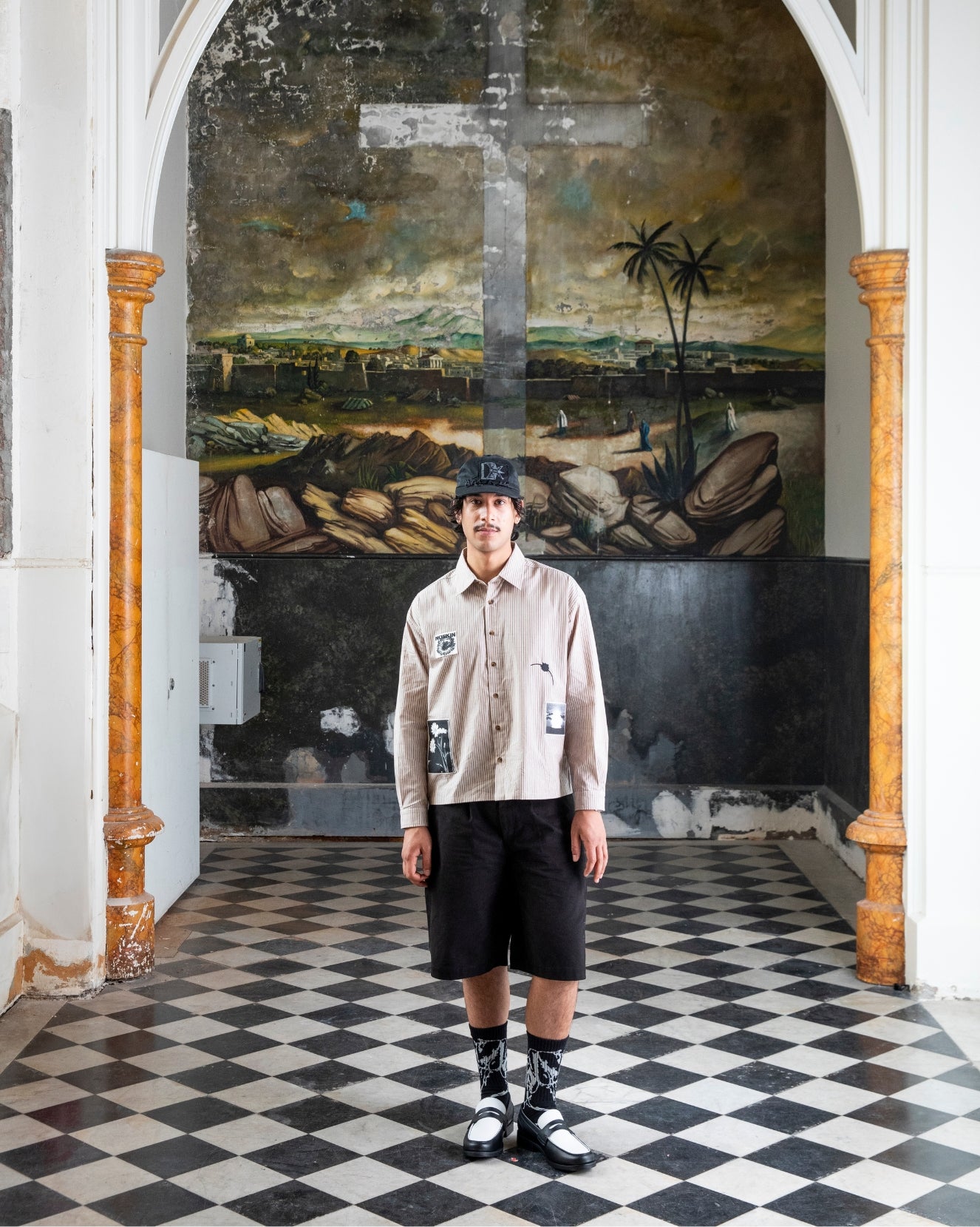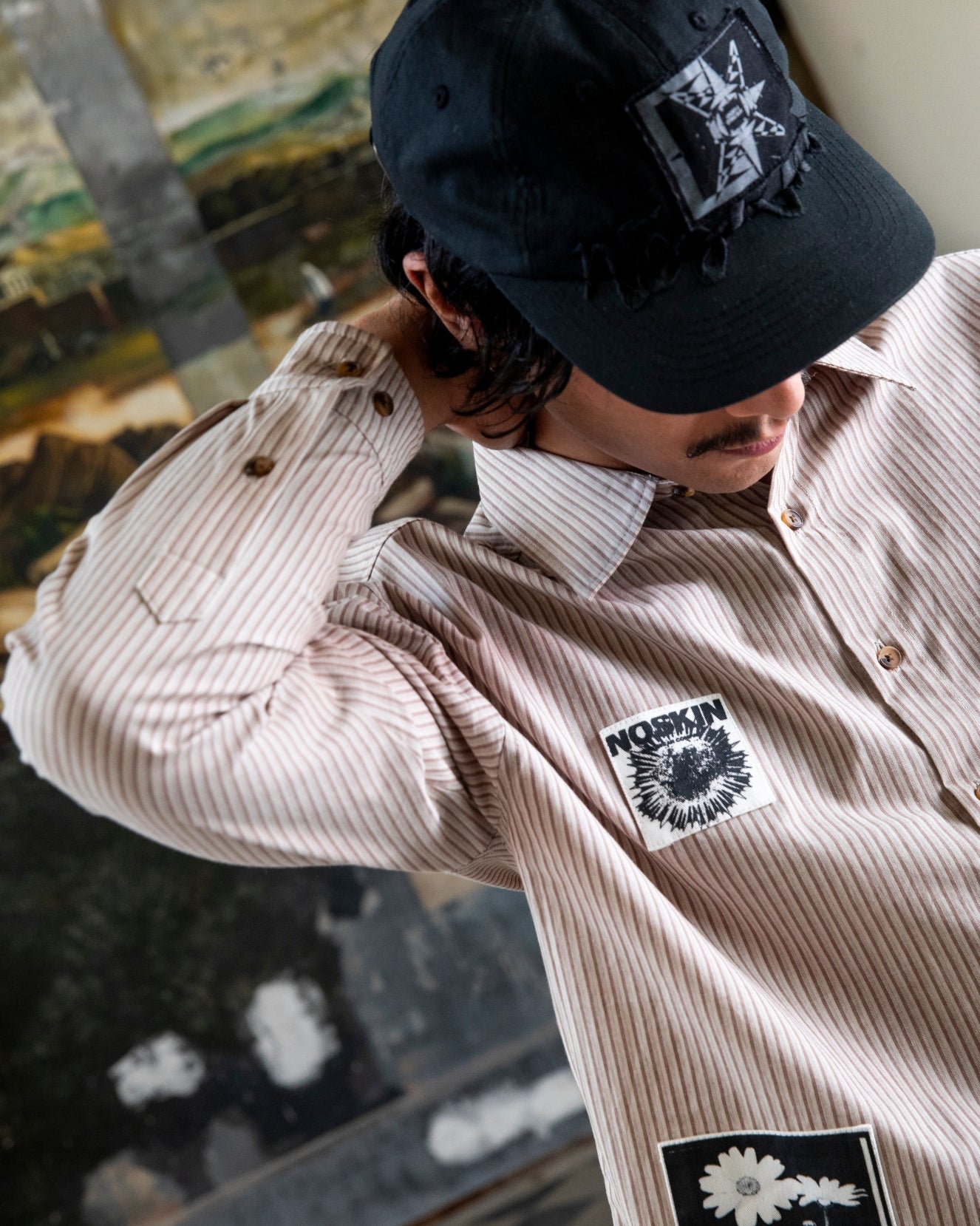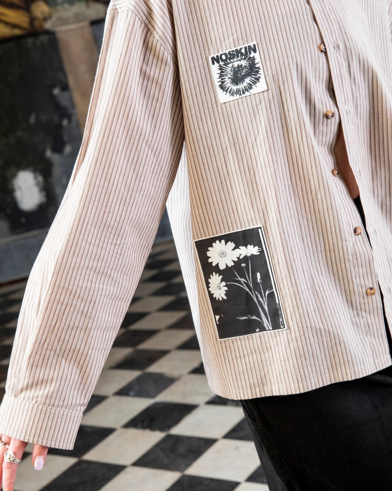 Lightweight striped button-up shirt with embroidered Under a Dying Sun motif, graphic patches and faux tortoise-shell buttons.