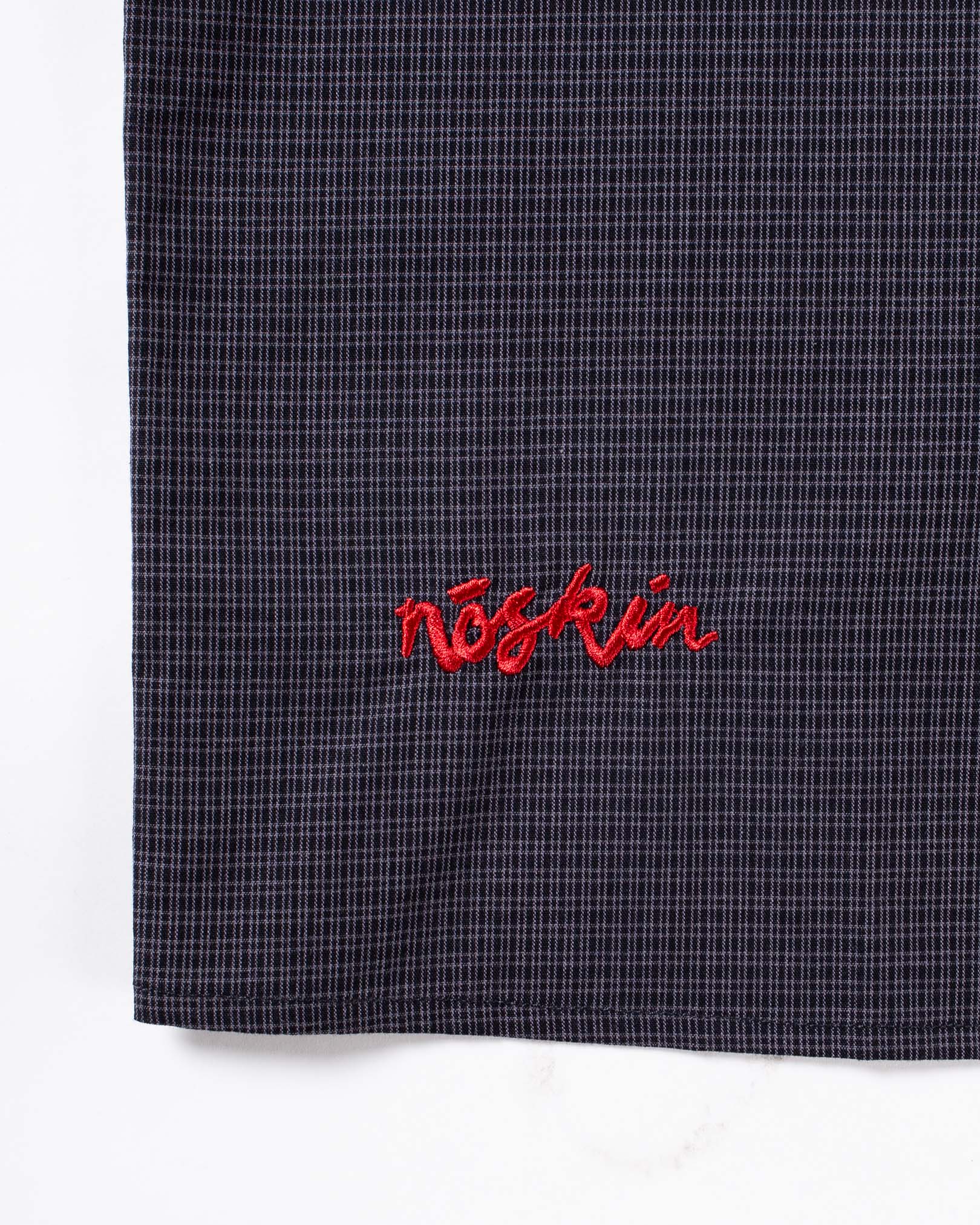 Lightweight checked button-up shirt with embroidered script logo and oversized front pocket.