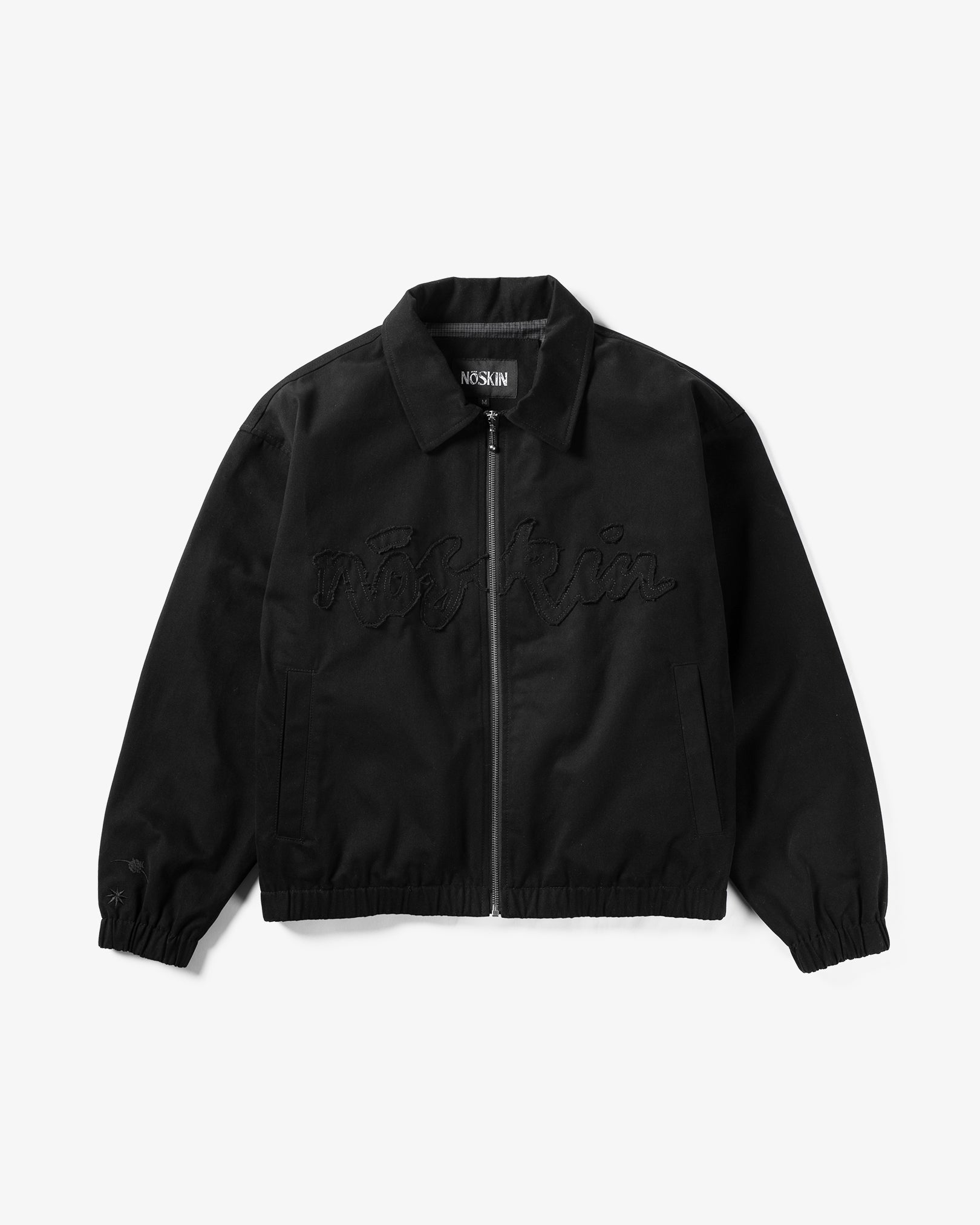 Coaches jacket with tonal frayed logo across chest, custom zipper hardware and a reverse tonal screen print.