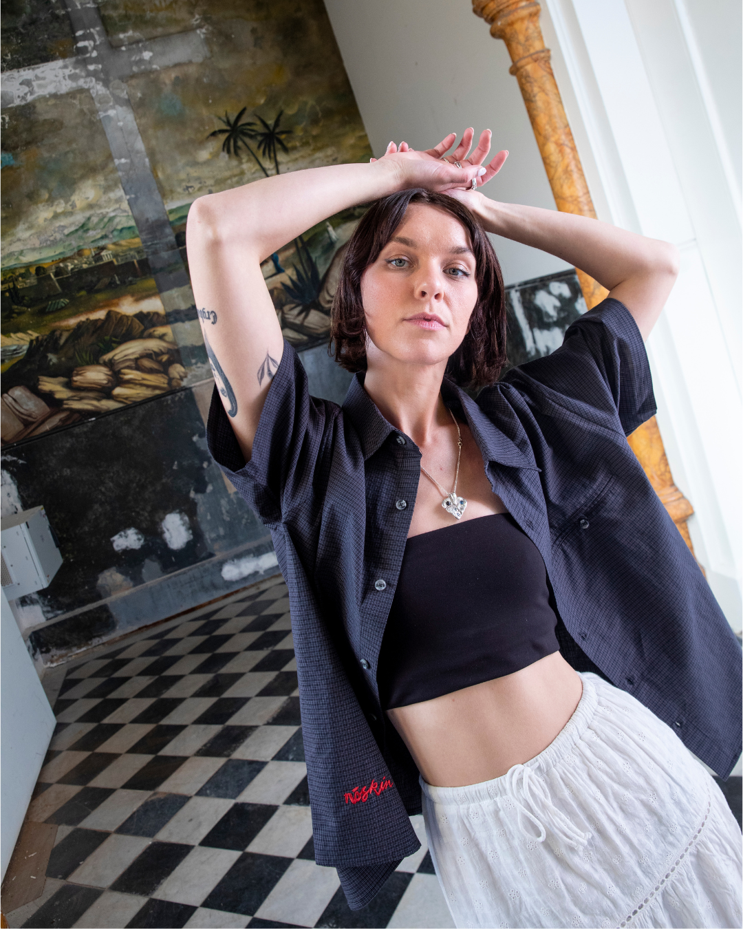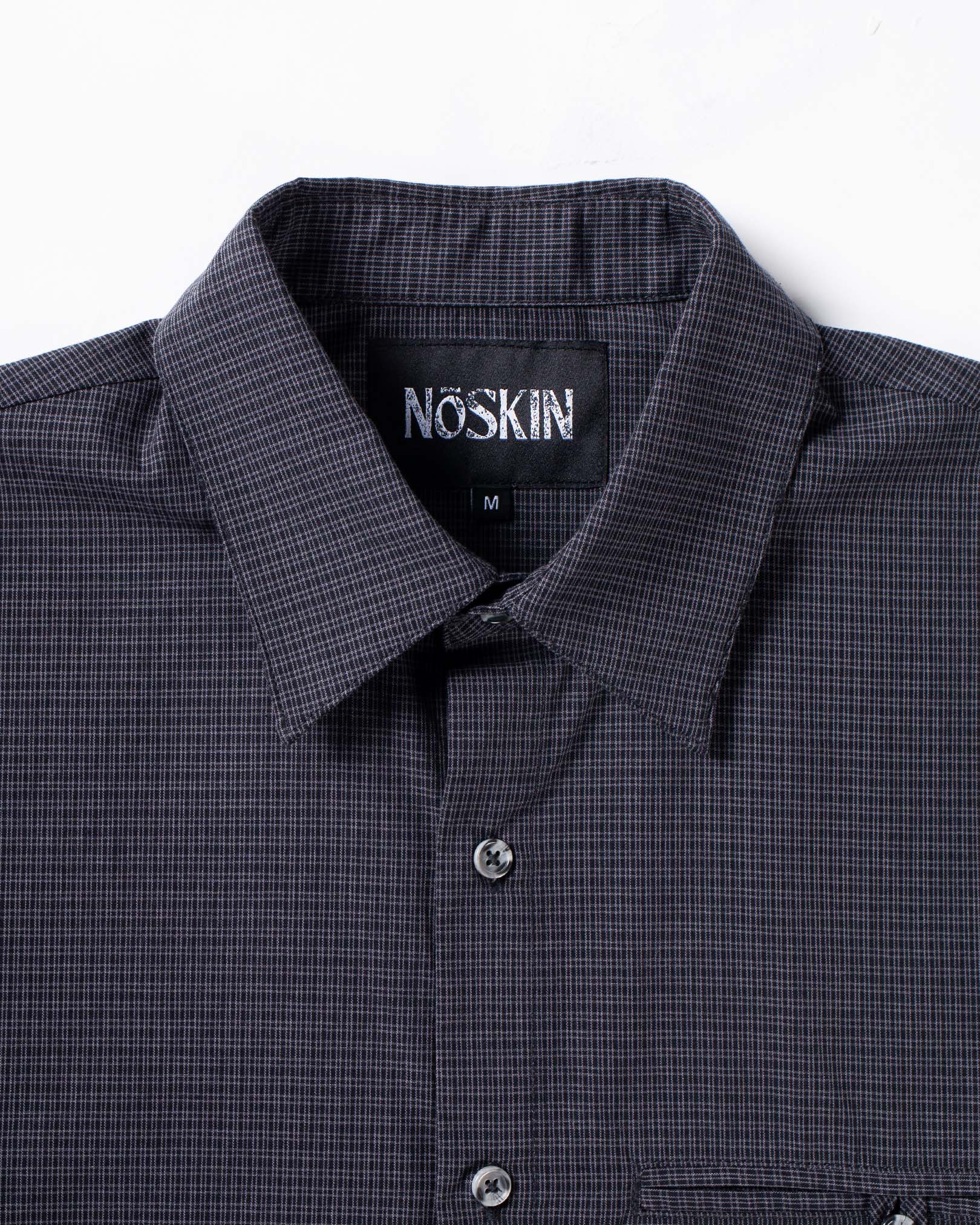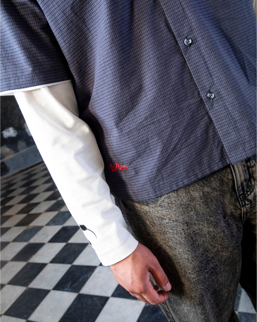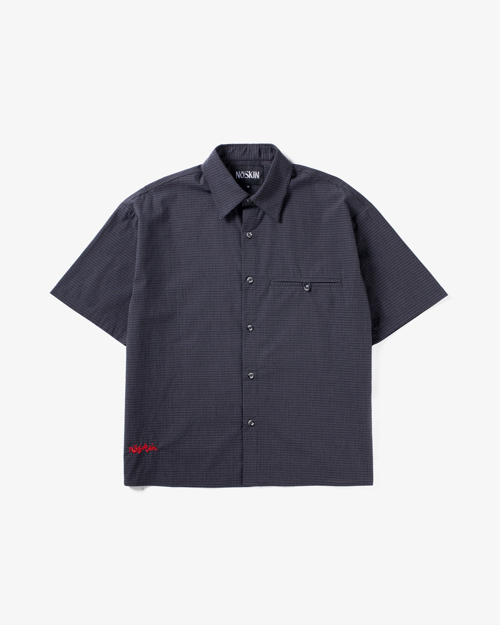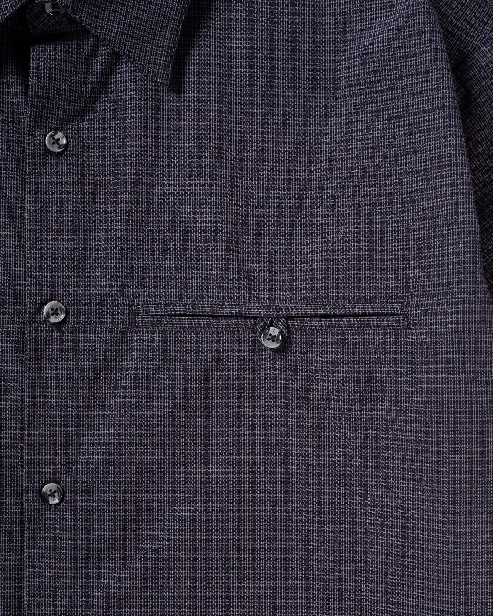 Lightweight checked button-up shirt with embroidered script logo and oversized front pocket.