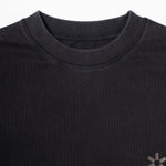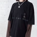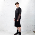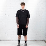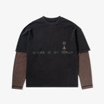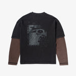 Dual layered long-sleeve shirt constructed from heavyweight 100% cotton. Overlocked black stitching details and front and reverse screen prints.