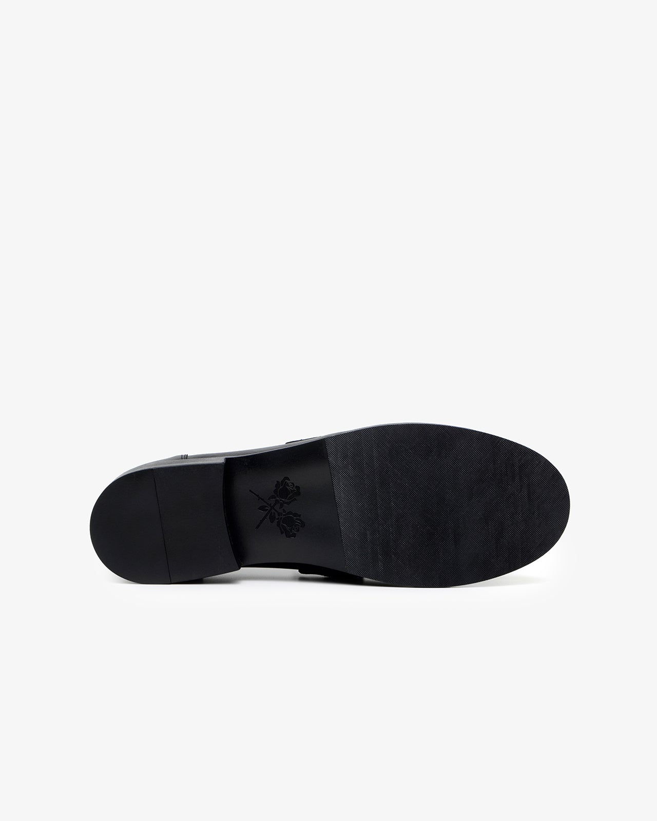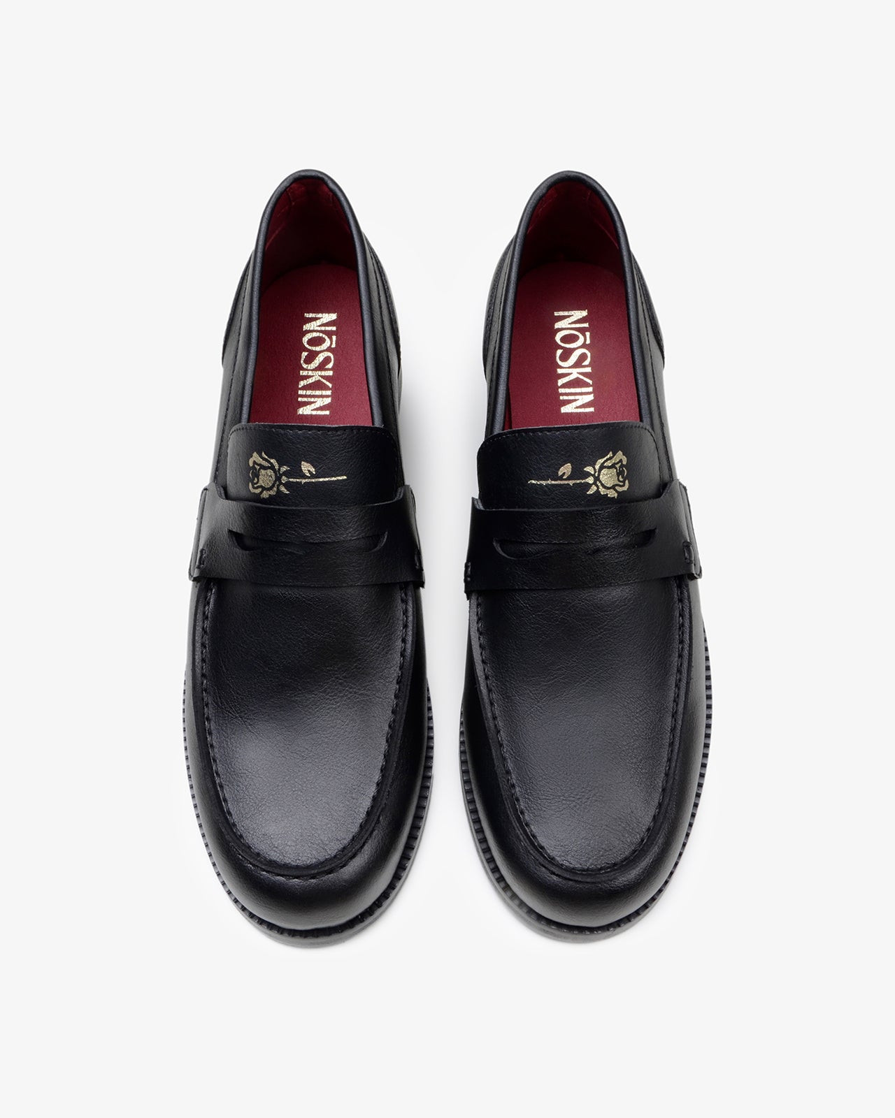 Black matte finish / gold foiled logo on tongue / deep red breathable lining with gold foiled logo on footbed  / custom Noskin dress sole with engraved rose icon and 'English Rose' on inner heel / water-resistant / fits true to size / ethically hand-crafted in Brazil