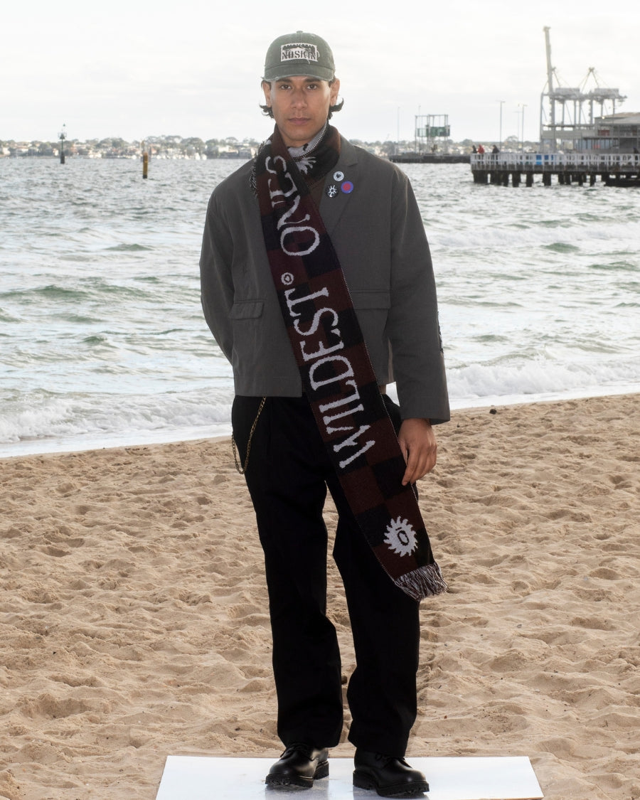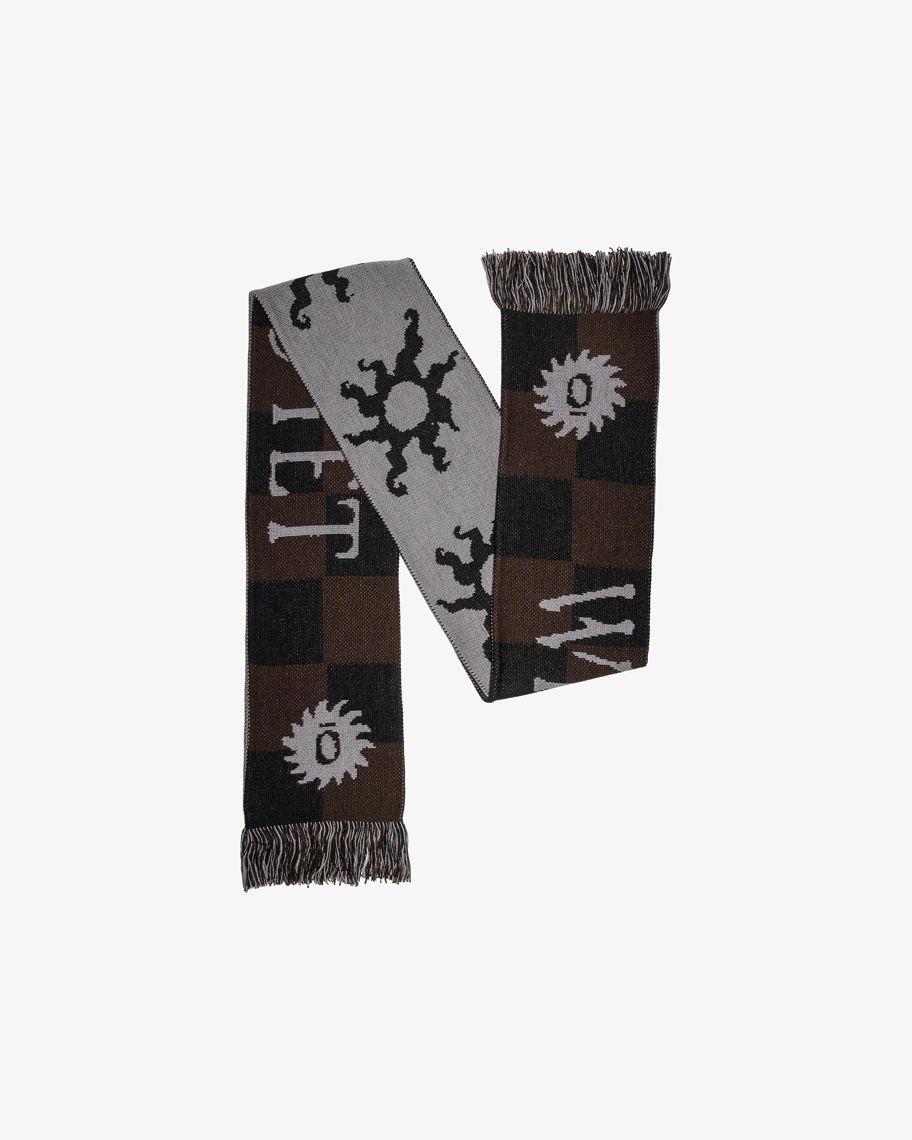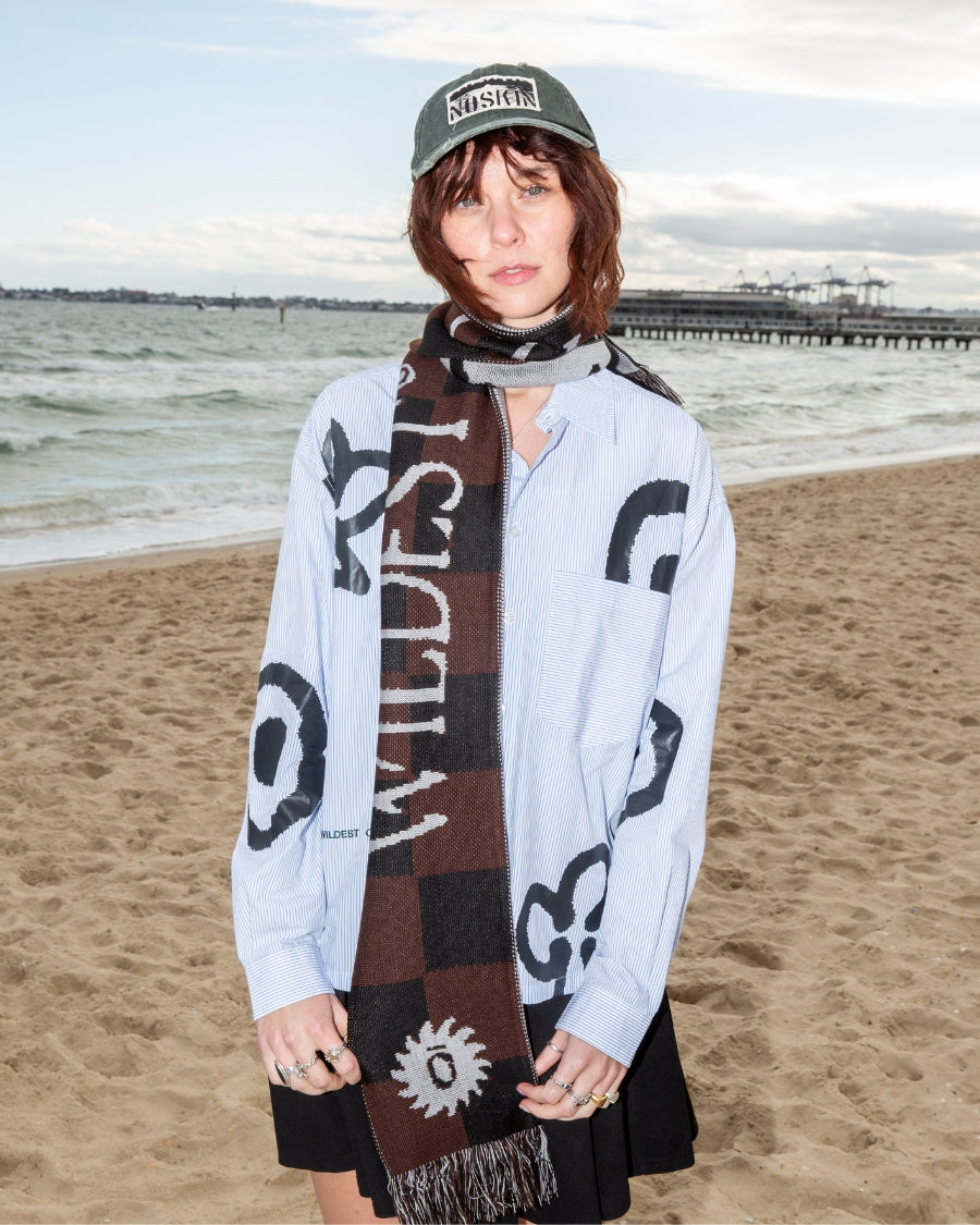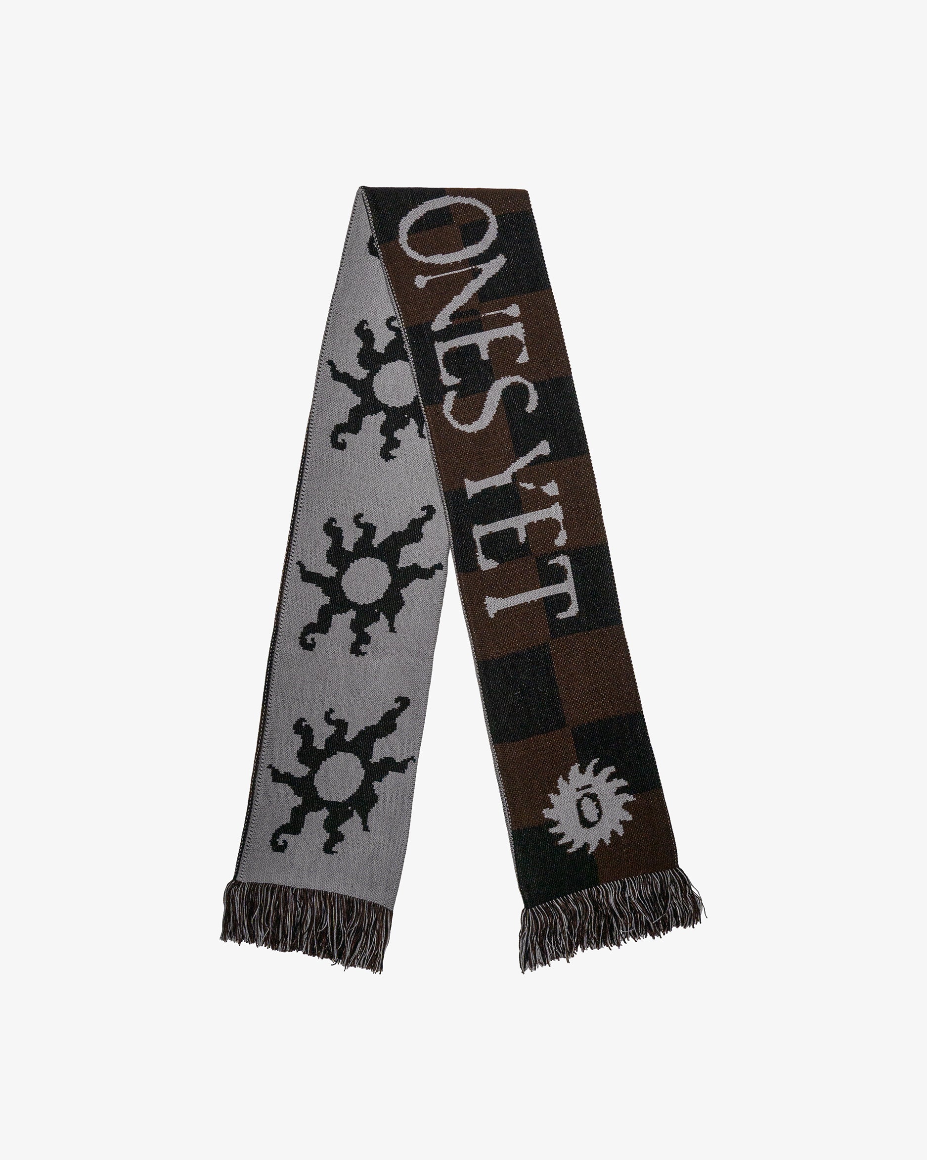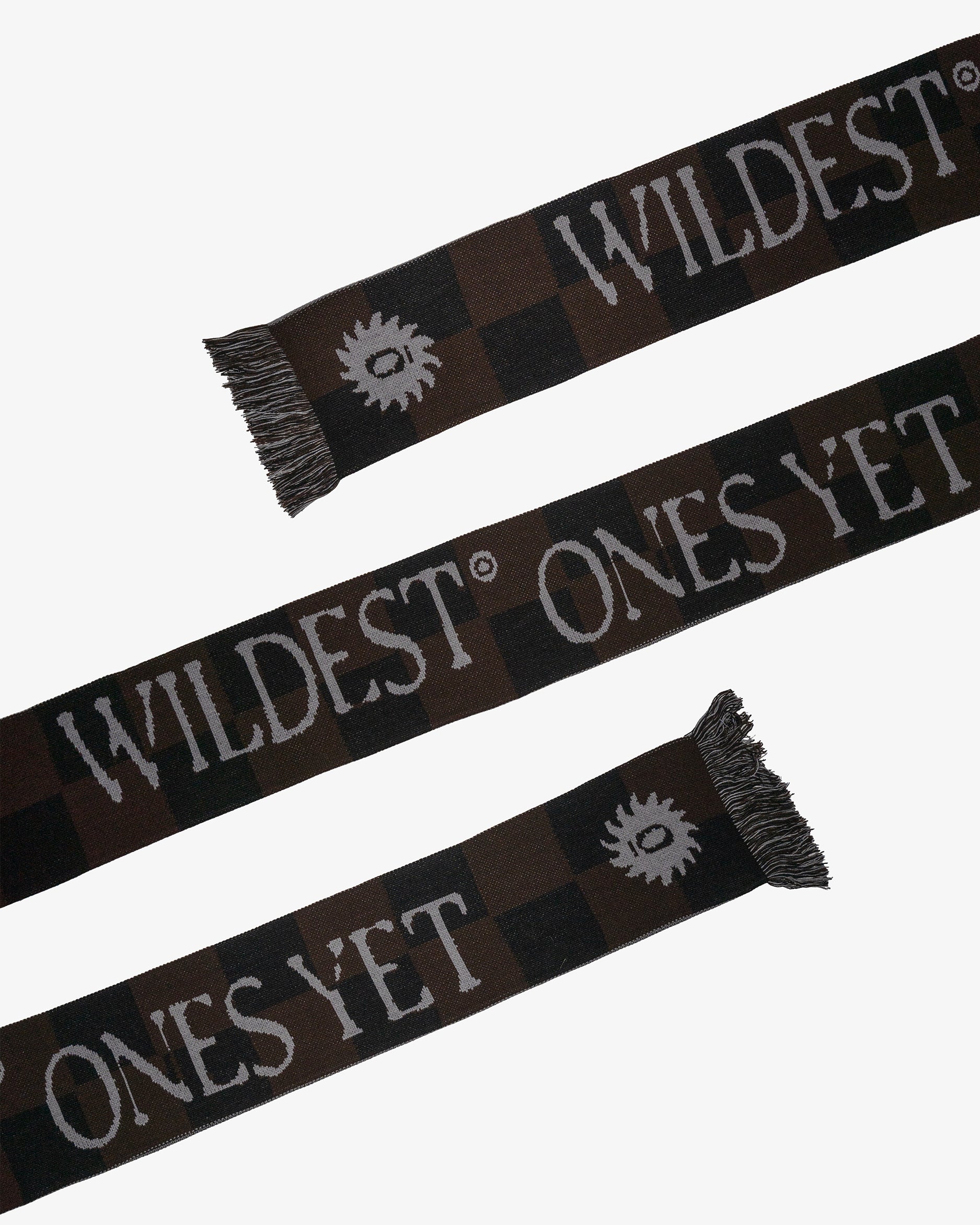 145cm woven cotton scarf with Whitsun icon design + Wildest Ones Yet reverse on battenberg background.