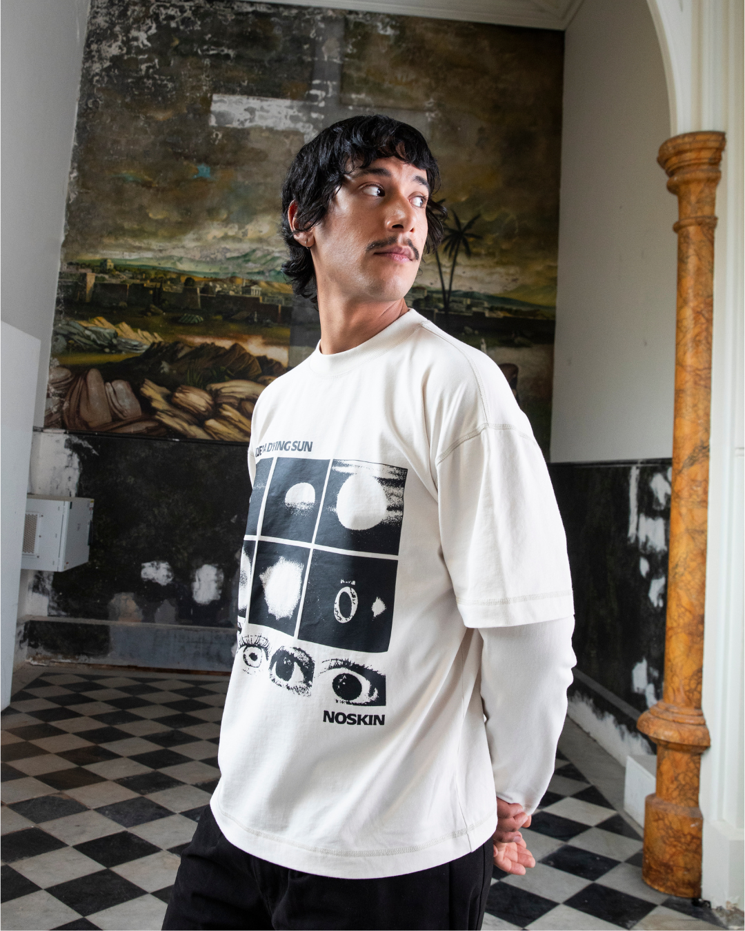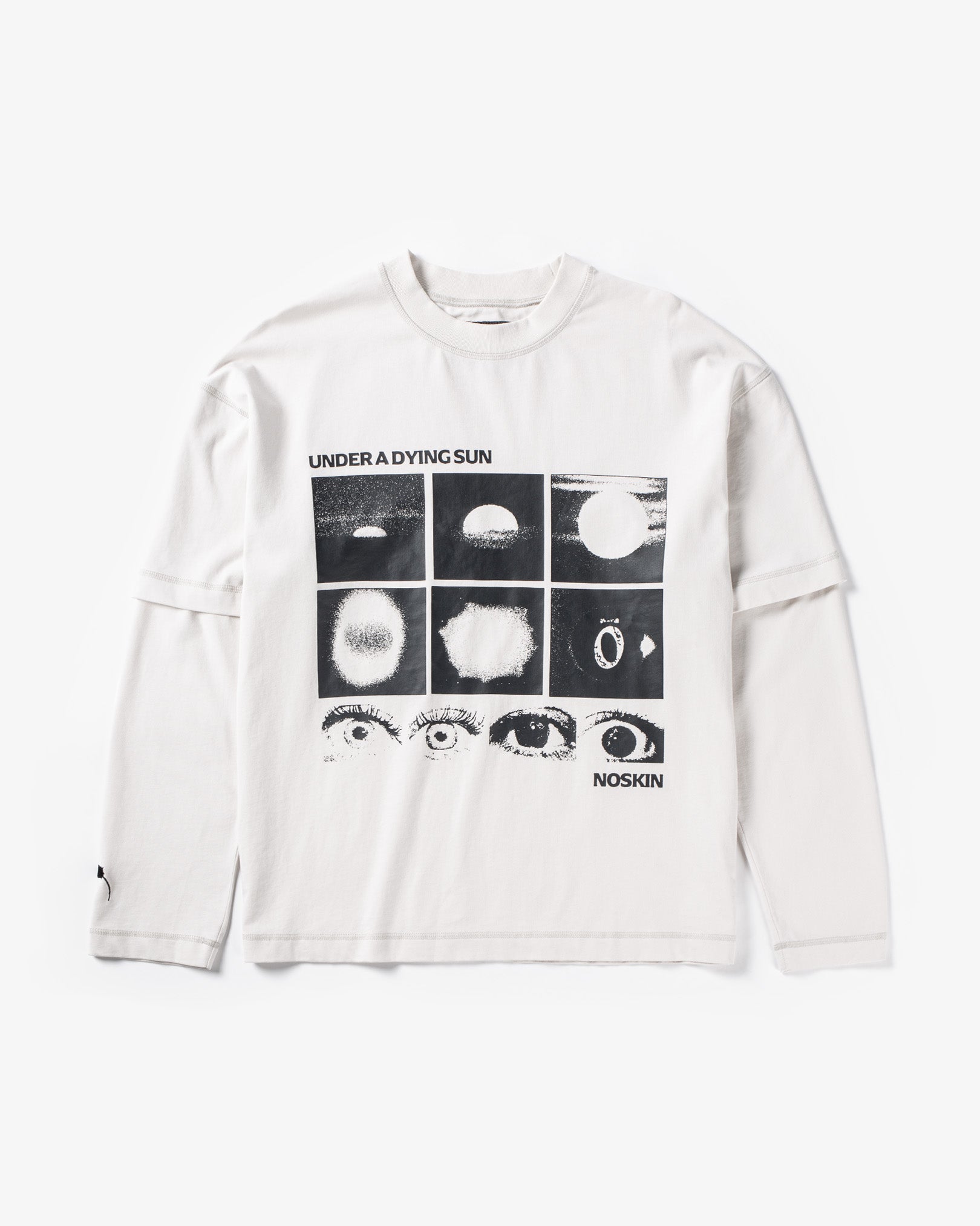 Dual layered long sleeve tee with premium quality screen print, embroidered detailing on sleeve and exposed overlocked stitching.