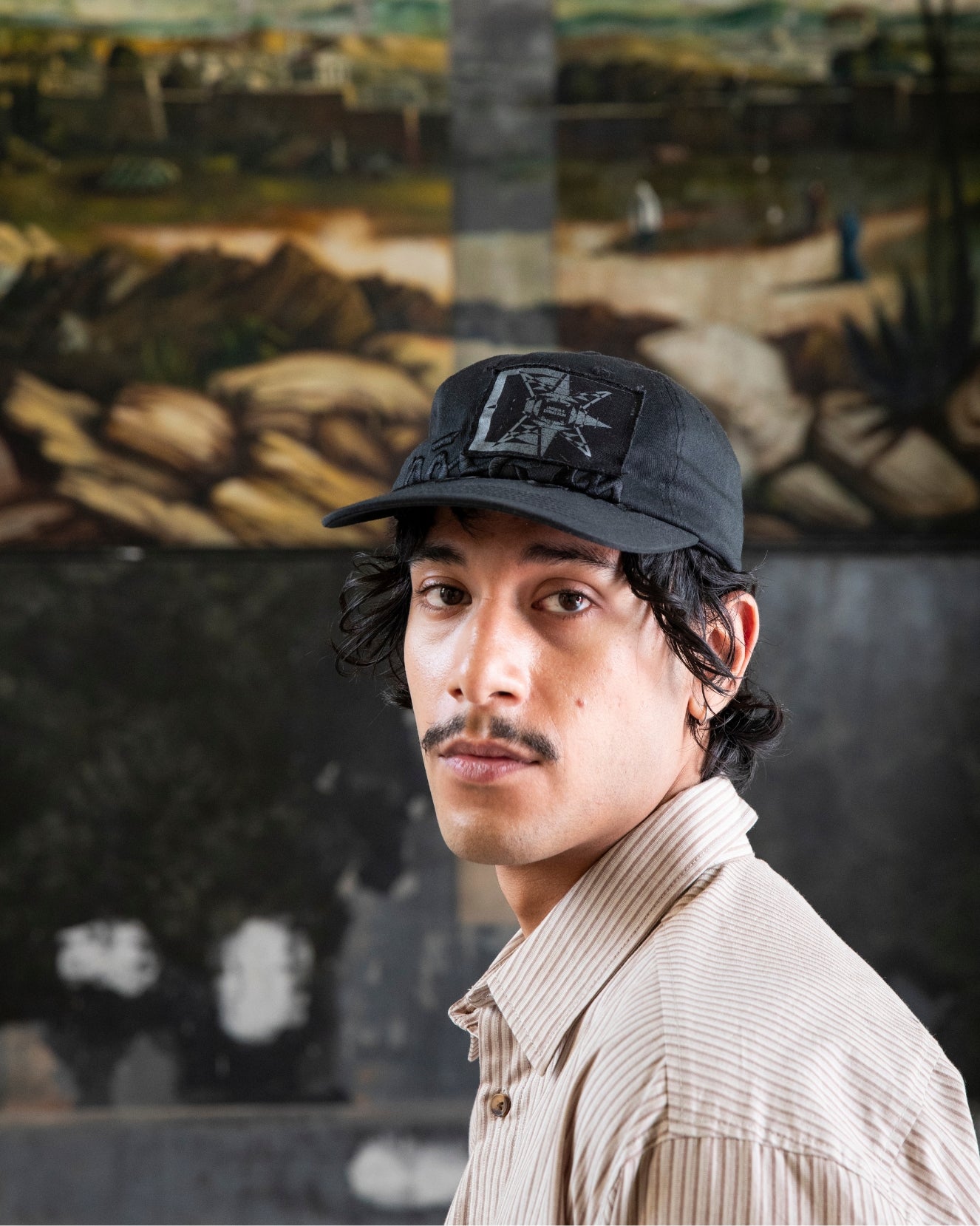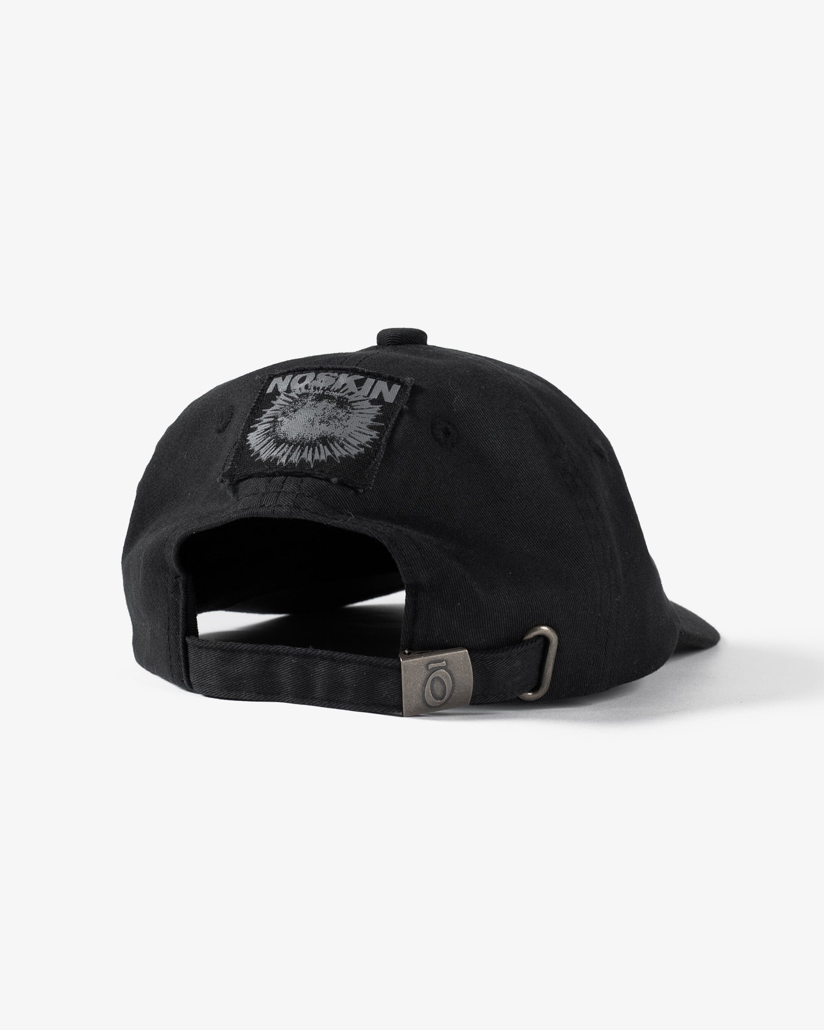 Distressed hat in black with embroidered overlapping details and a raw edged patch on the back. Brass logo embossed clasp size-adjuster.