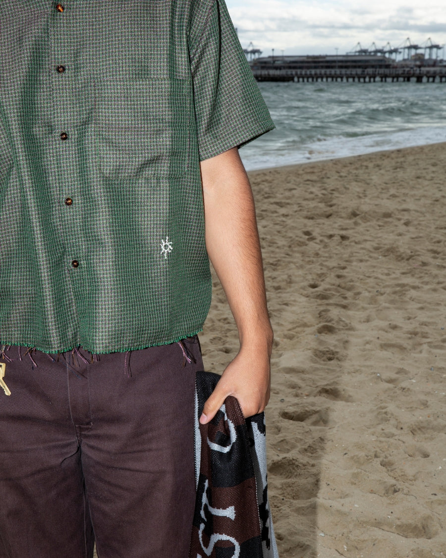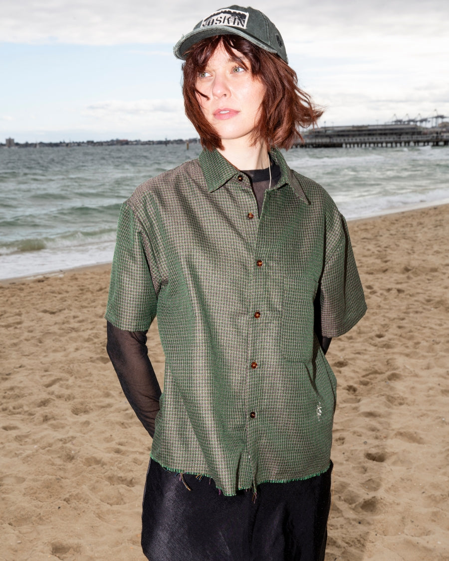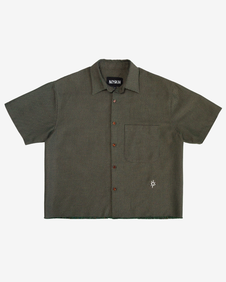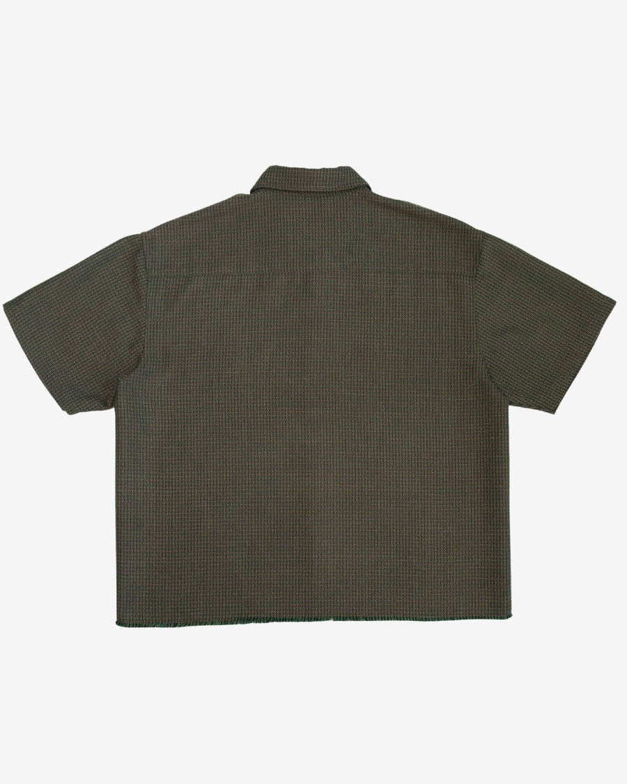 Short sleeve shirt in iridescent green plaid with contrast buttons. Whitsun icon embroidery below pocket, double stitched raw hem and a cropped boxy fit.