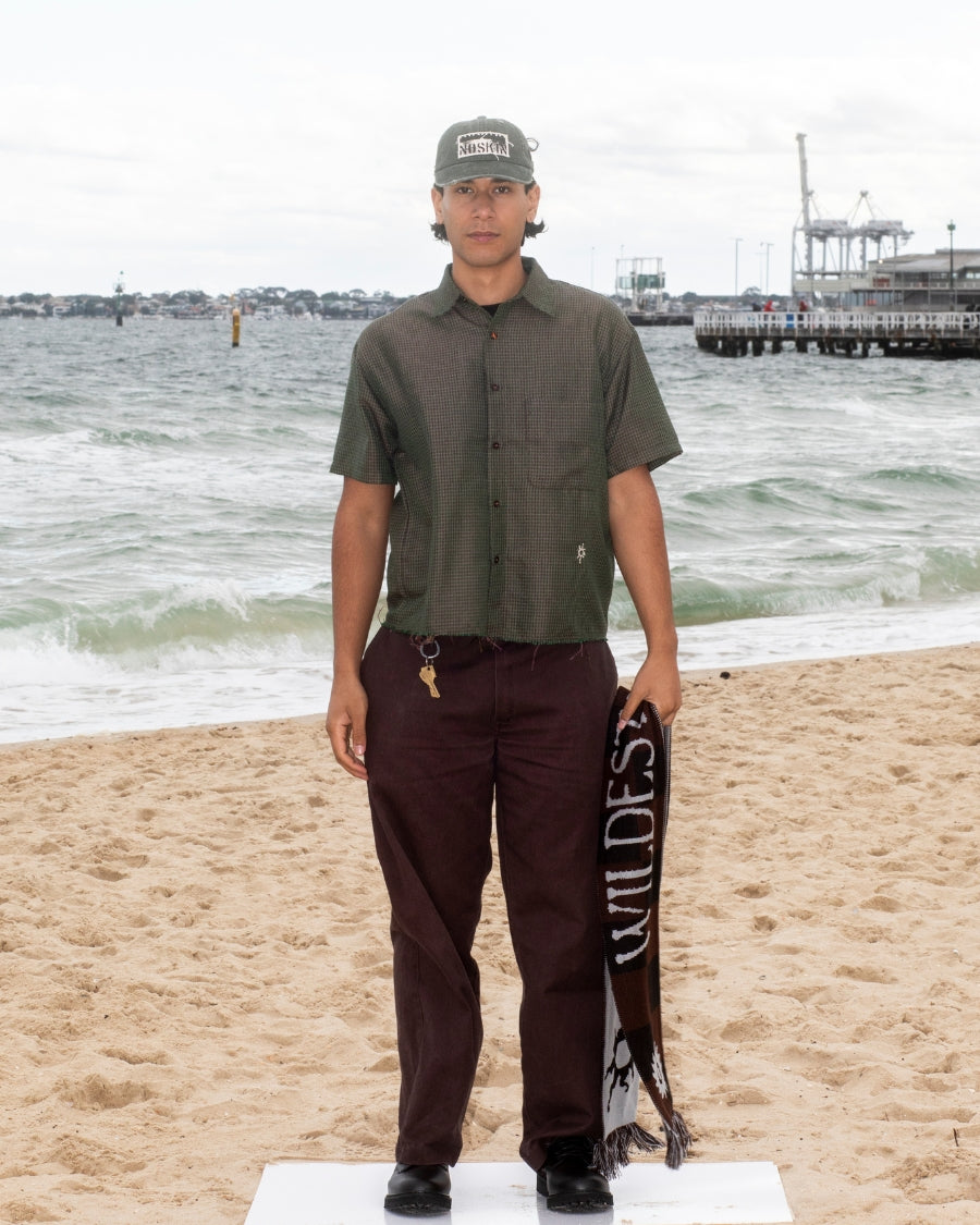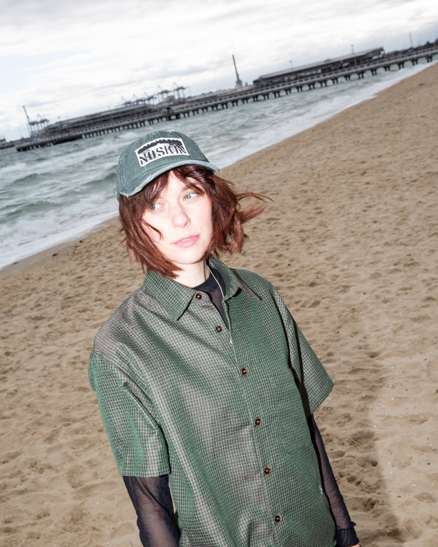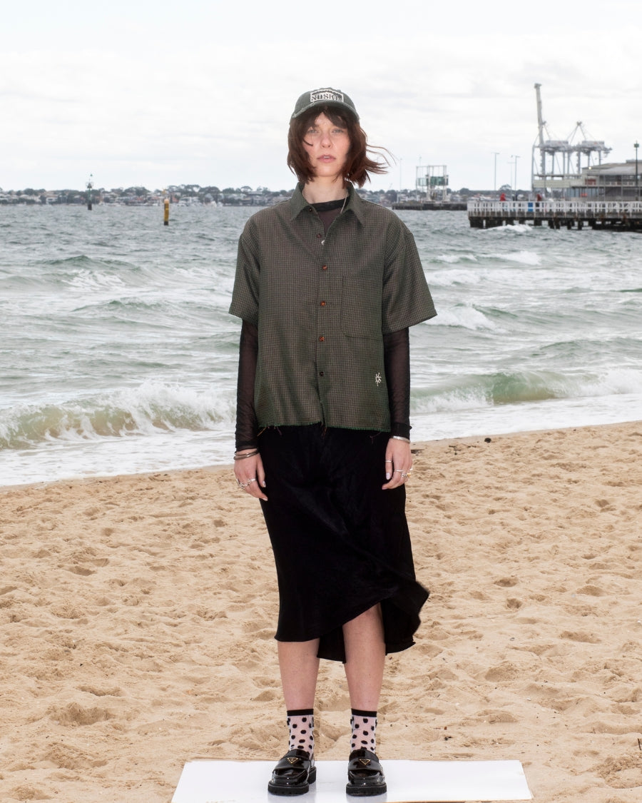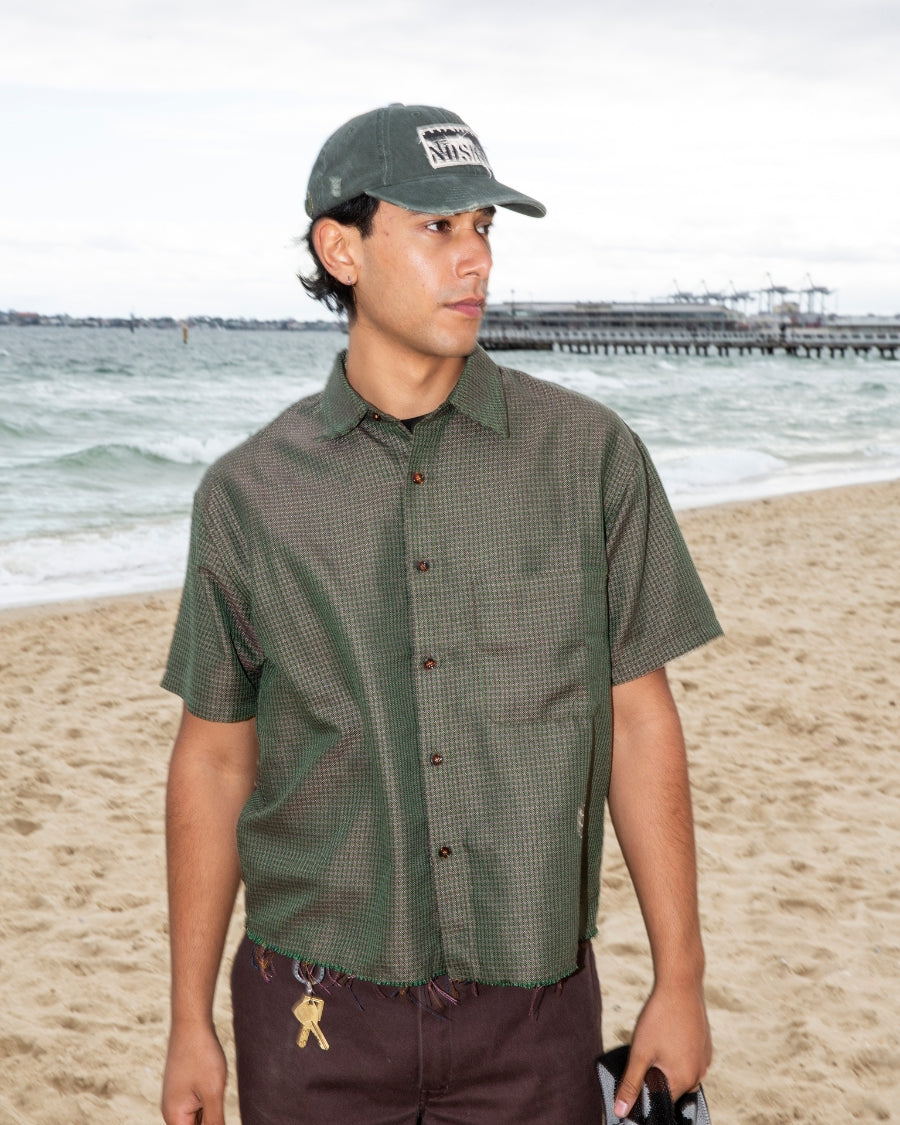 Short sleeve shirt in iridescent green plaid with contrast buttons. Whitsun icon embroidery below pocket, double stitched raw hem and a cropped boxy fit.
