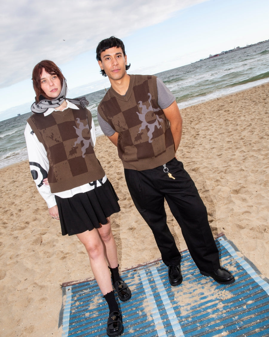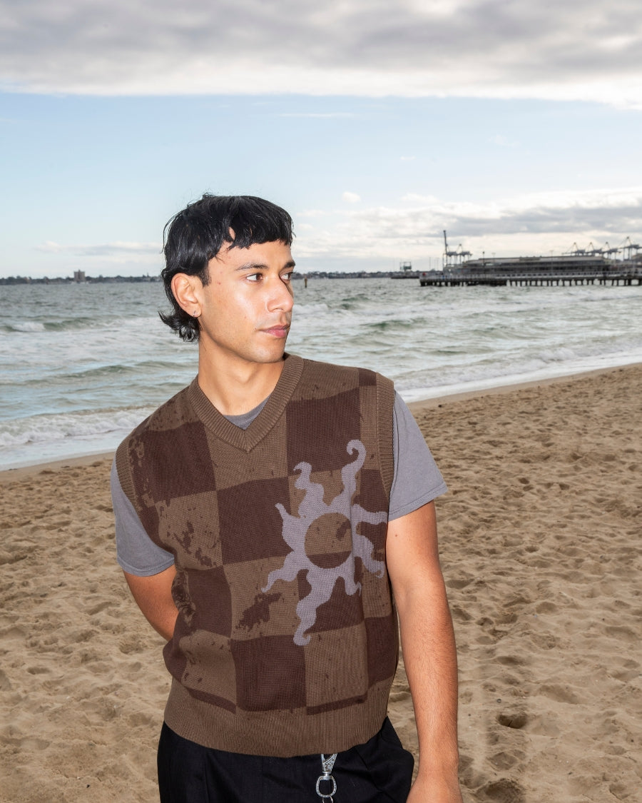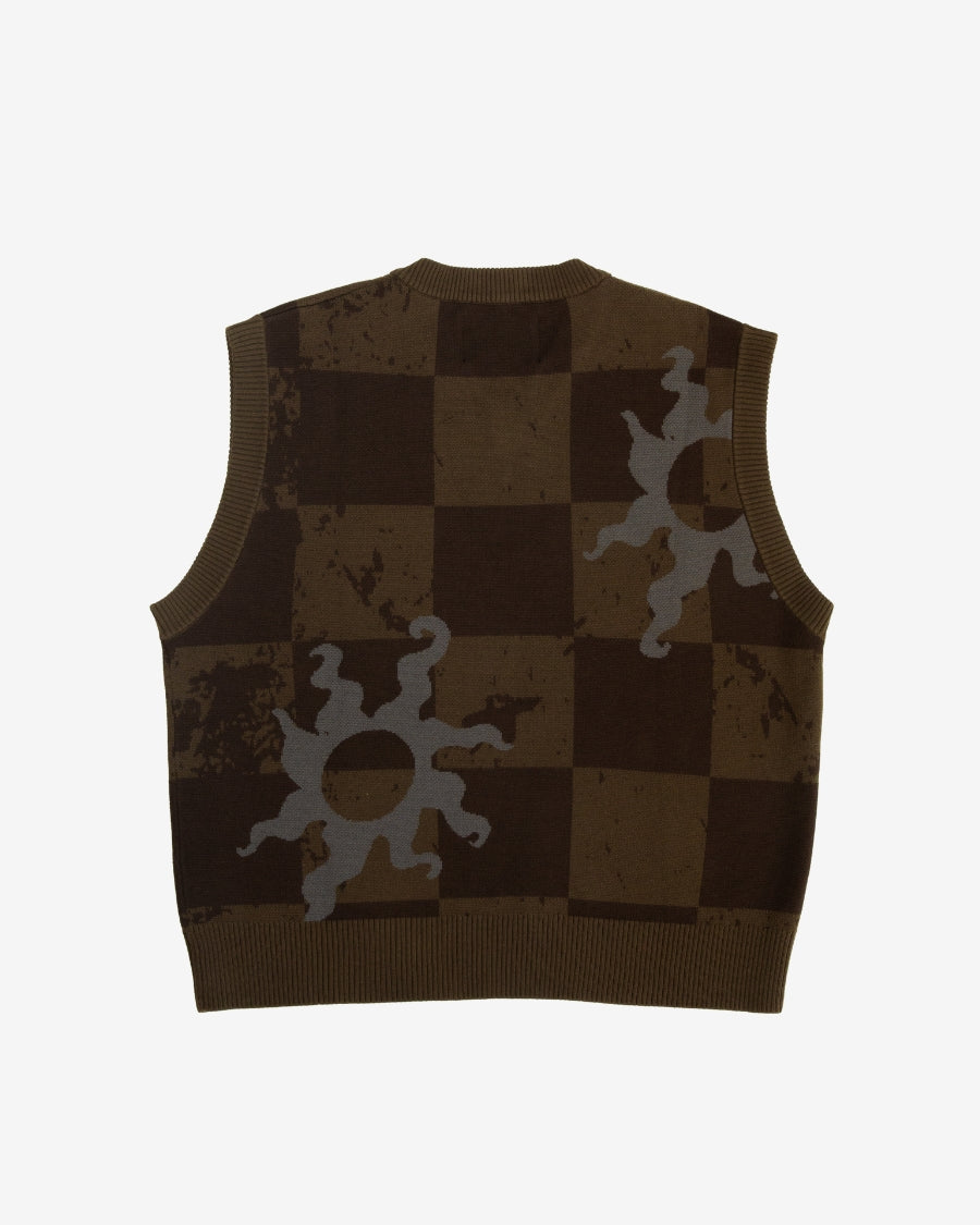 Knit vest with woven pattern and whitsun icon on front and back. Cropped boxy fit - fits true to size.