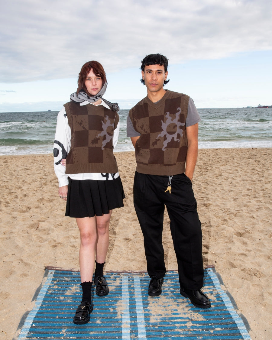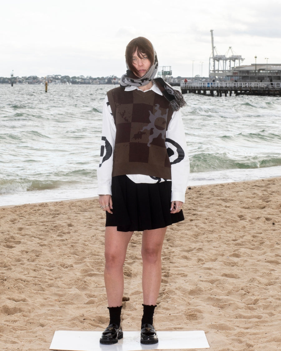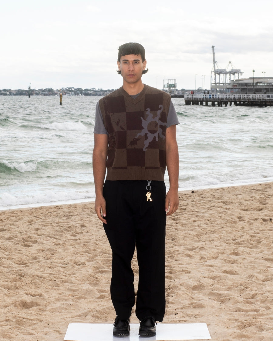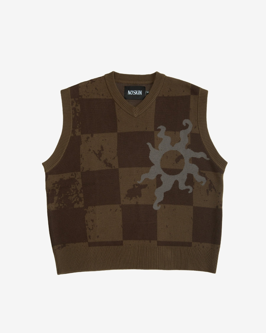 Knit vest with woven pattern and whitsun icon on front and back. Cropped boxy fit - fits true to size.