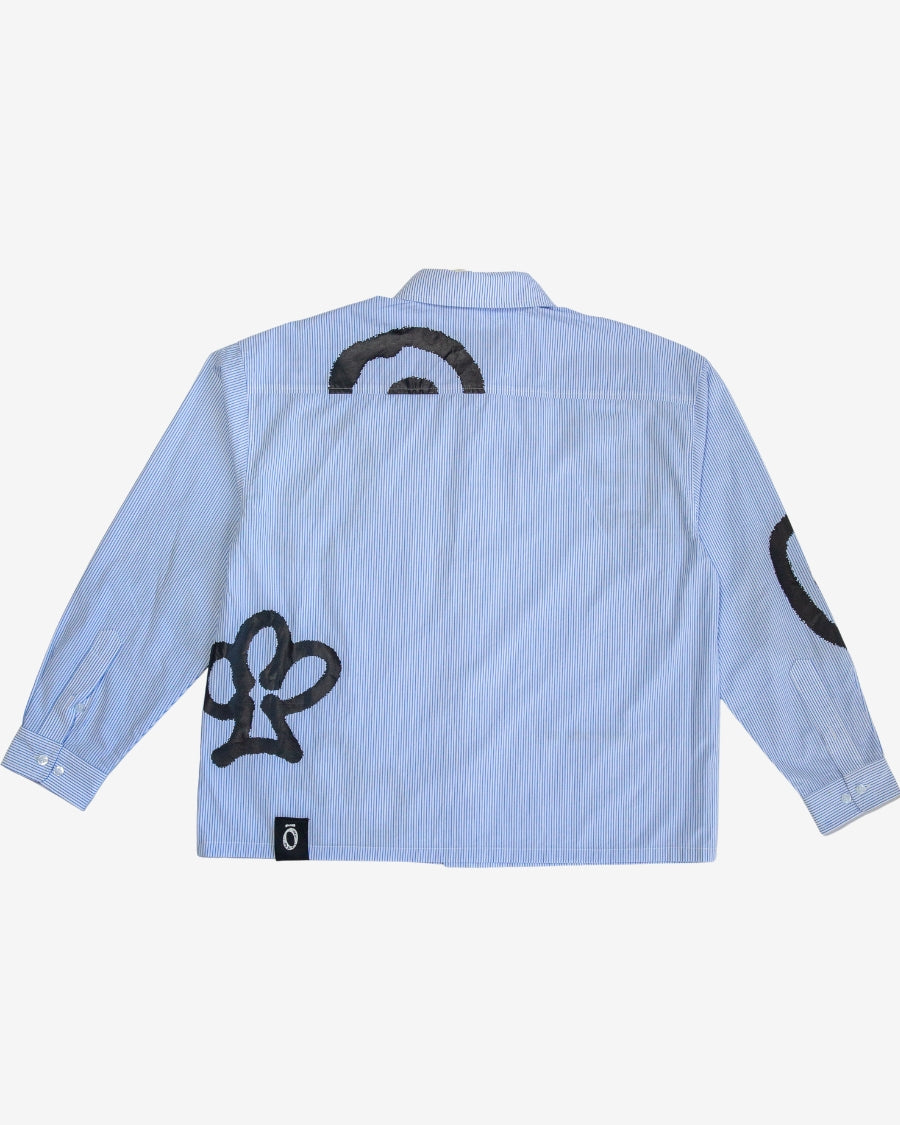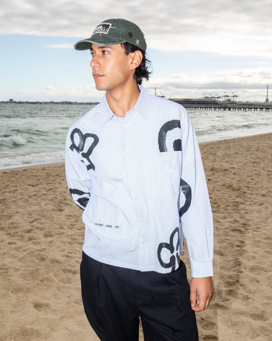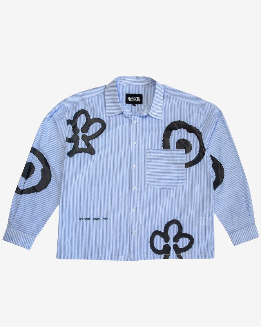 Long sleeve shirt in premium pin-striped blue cotton with oversized screen prints running over front and back. Wildest Ones Yet embroidery in deep green and a cropped boxy fit.