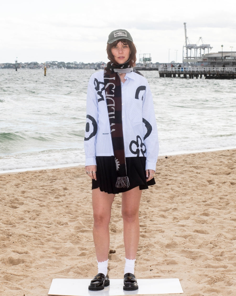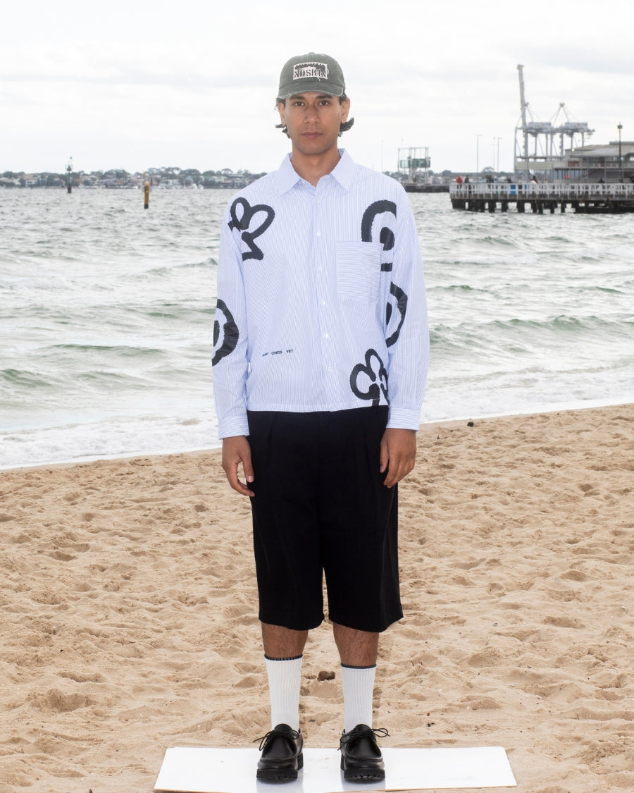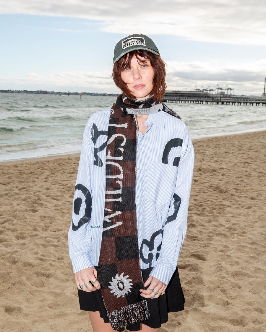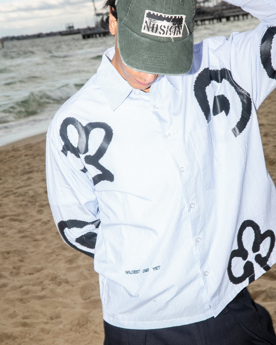 Long sleeve shirt in premium pin-striped blue cotton with oversized screen prints running over front and back. Wildest Ones Yet embroidery in deep green and a cropped boxy fit.
