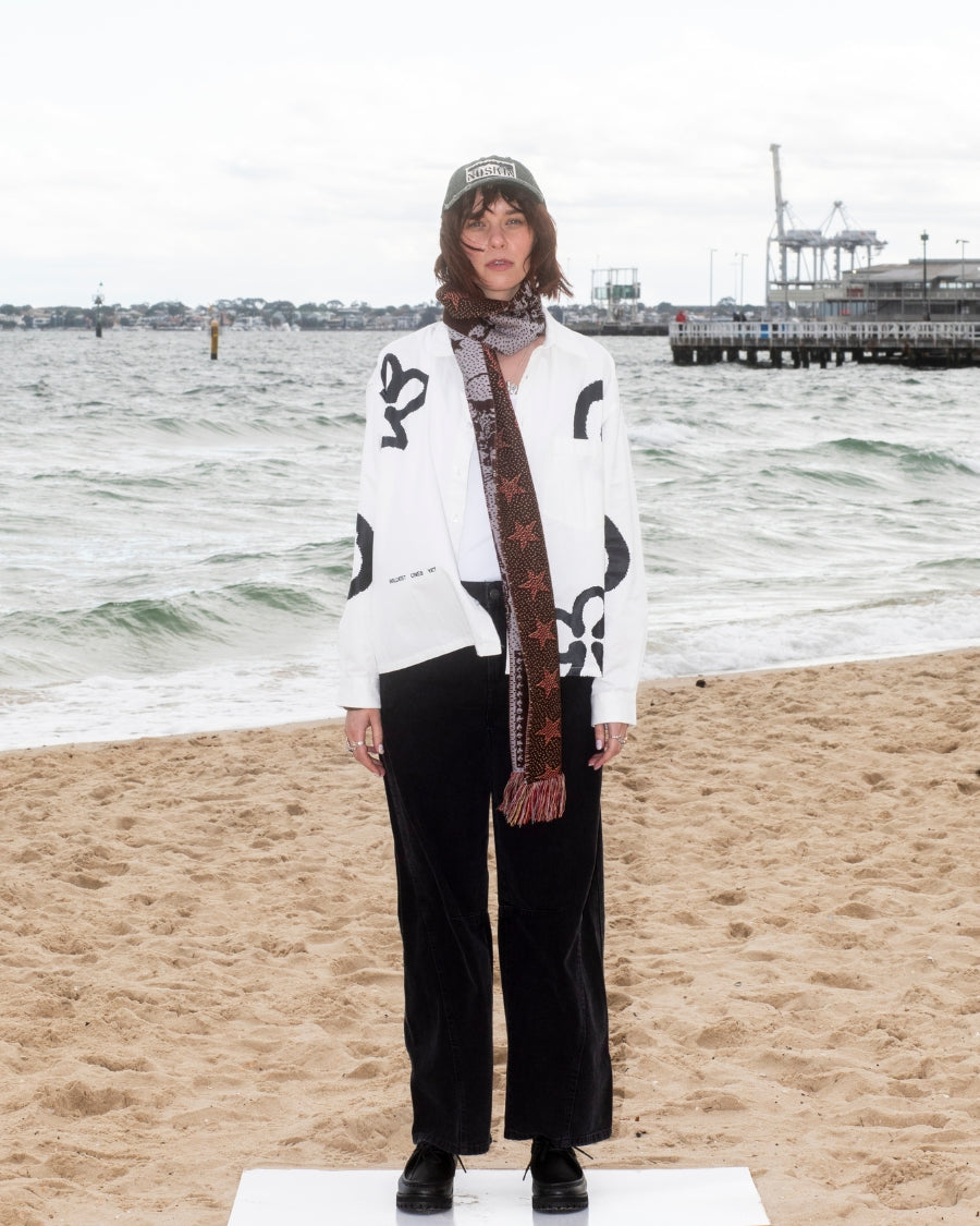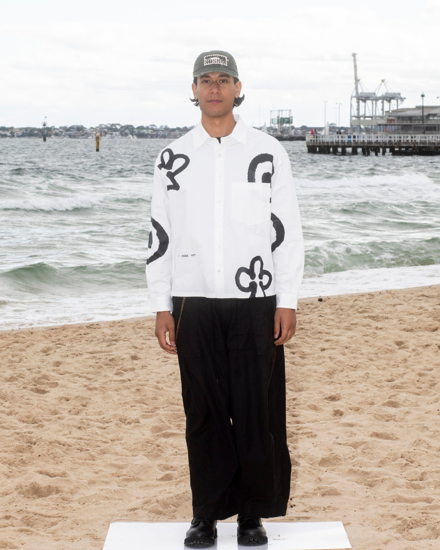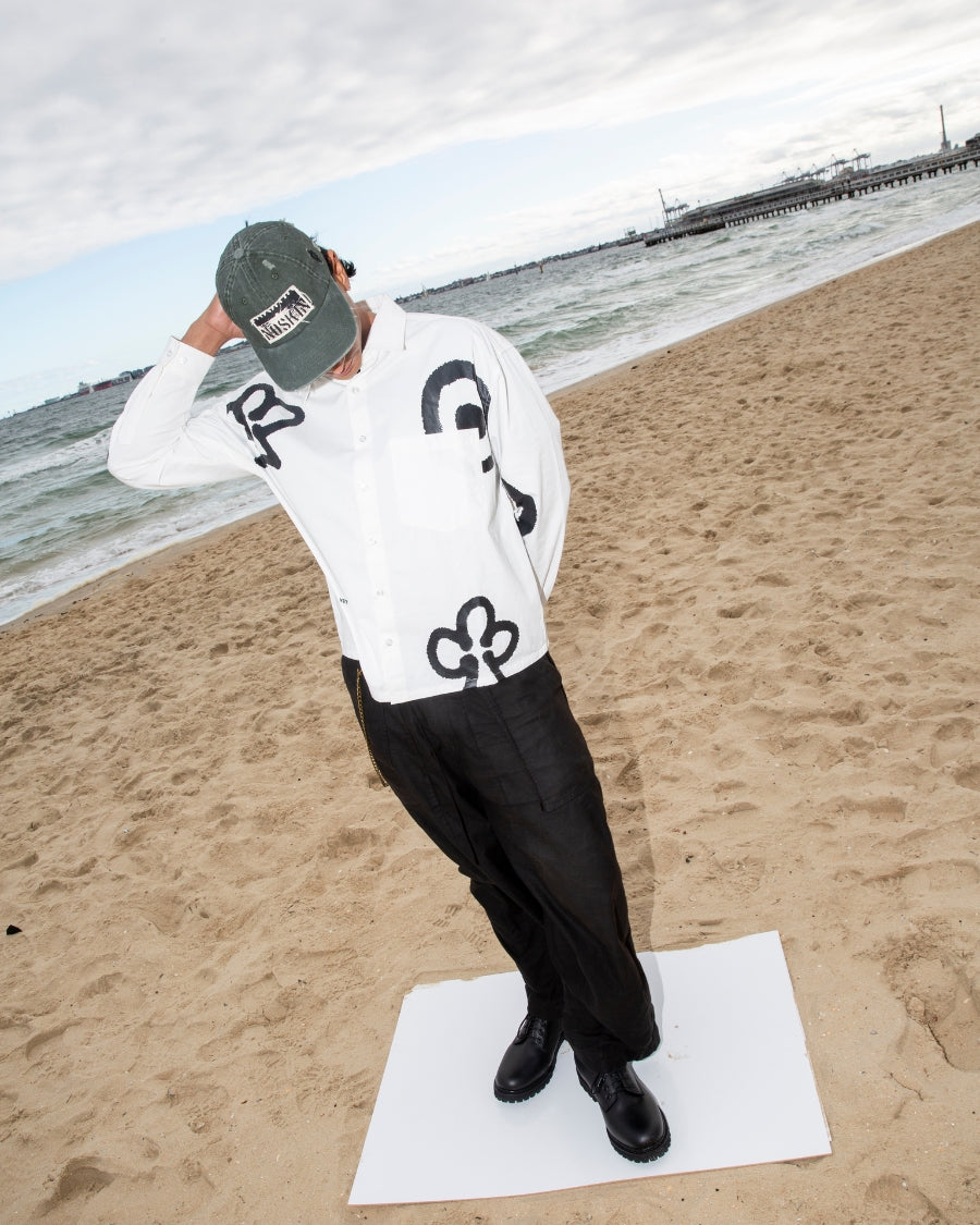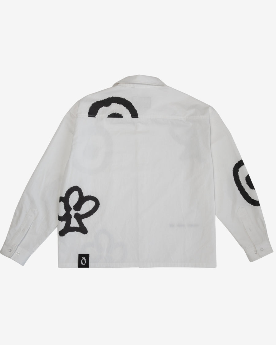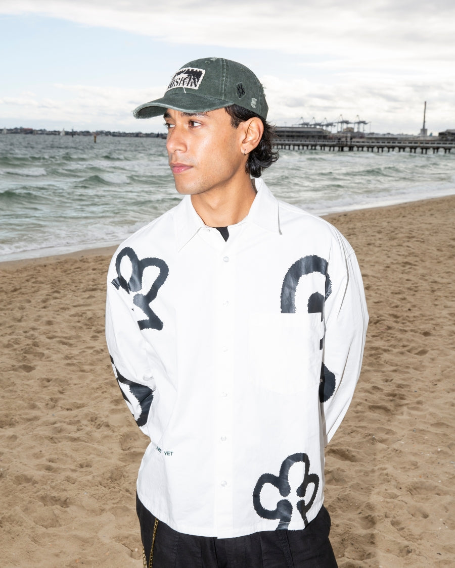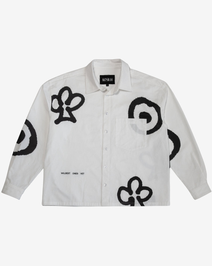 Long sleeve shirt in premium heavy white cotton with oversized screen prints running over front and back. Wildest Ones Yet embroidery in deep green and a cropped boxy fit.
